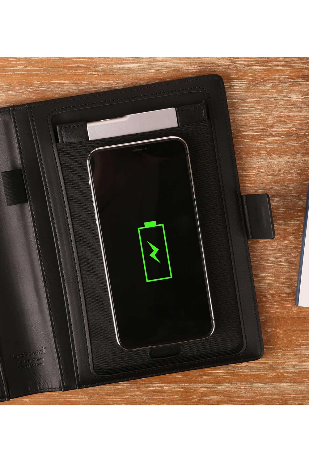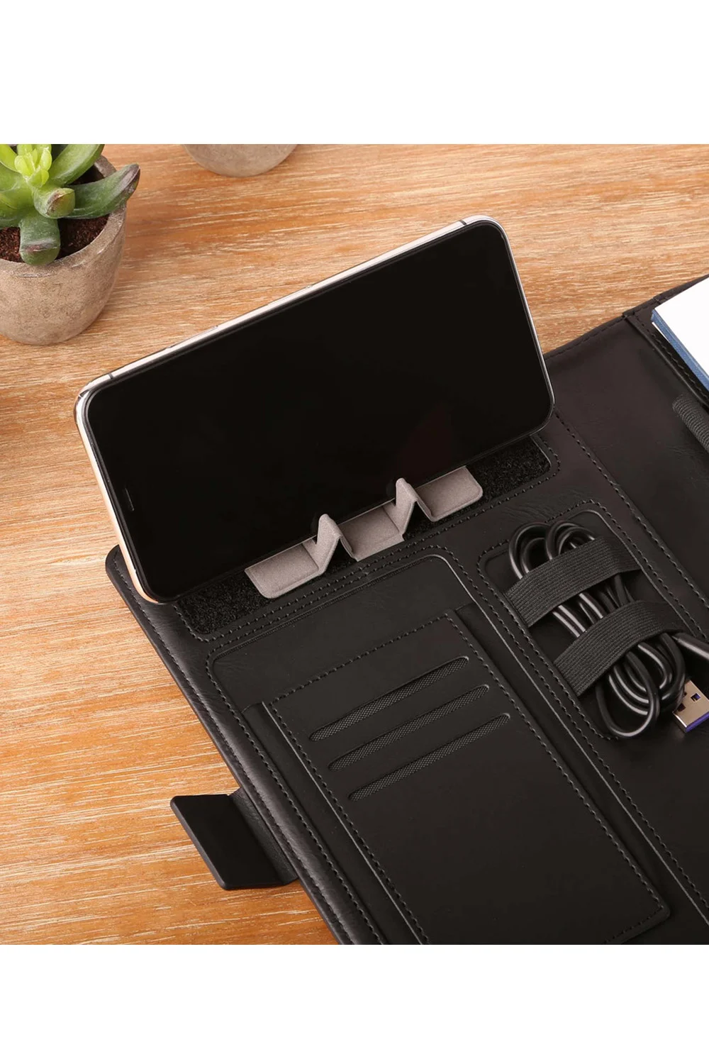 The Jot N Jolt Charging Portfolio is a compact vegan leather padfolio designed to keep essentials organized while adding convenient phone charging. Measuring 9 in x 7.5 in, it features multiple storage pockets and an adjustable phone stand built into the inside cover for hands free viewing. Inside, it includes a bullet journal style notebook for notes and planning. A 15W ultra thin removable wireless charging powerbank is integrated into the back cover, providing convenient on the go charging for compatible devices.