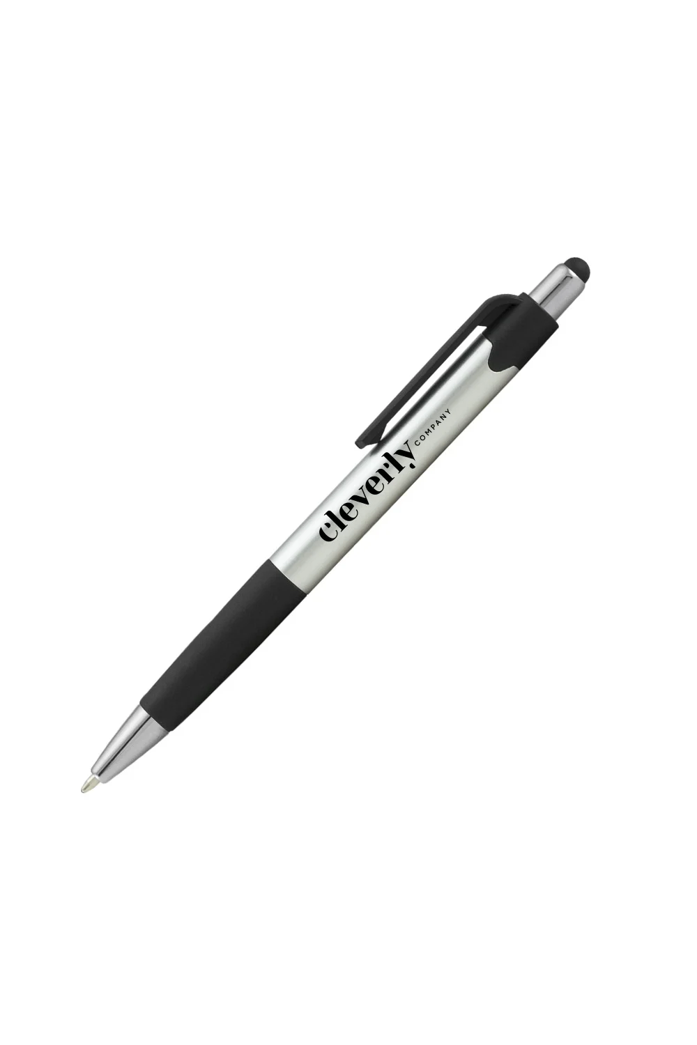 The Smoothy Metallic Stylus Pen is a versatile medium ballpoint plastic pen designed for comfortable everyday writing. It features a metallic finish barrel with polished chrome accents and black trim for a modern, refined look. The large soft rubber grip provides added comfort and control during extended use. Equipped with black ink and an integrated stylus tip, it allows smooth writing on paper and easy navigation on touchscreens.